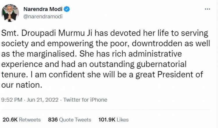 On Draupadi Murmu being elected as NDA's presidential candidate, Prime Minister Narendra Modi tweeted, "I believe she will be a great President." The PM wrote, that Draupadi Murmu has dedicated her life to the service of society. She has rich administrative experience and has had an excellent tenure. I am sure she will be a great President of the country. Millions of people, especially those who have experienced poverty and faced hardships, draw great power from Murmu's life. Her understanding and compassionate nature of policy matters will greatly benefit the country.